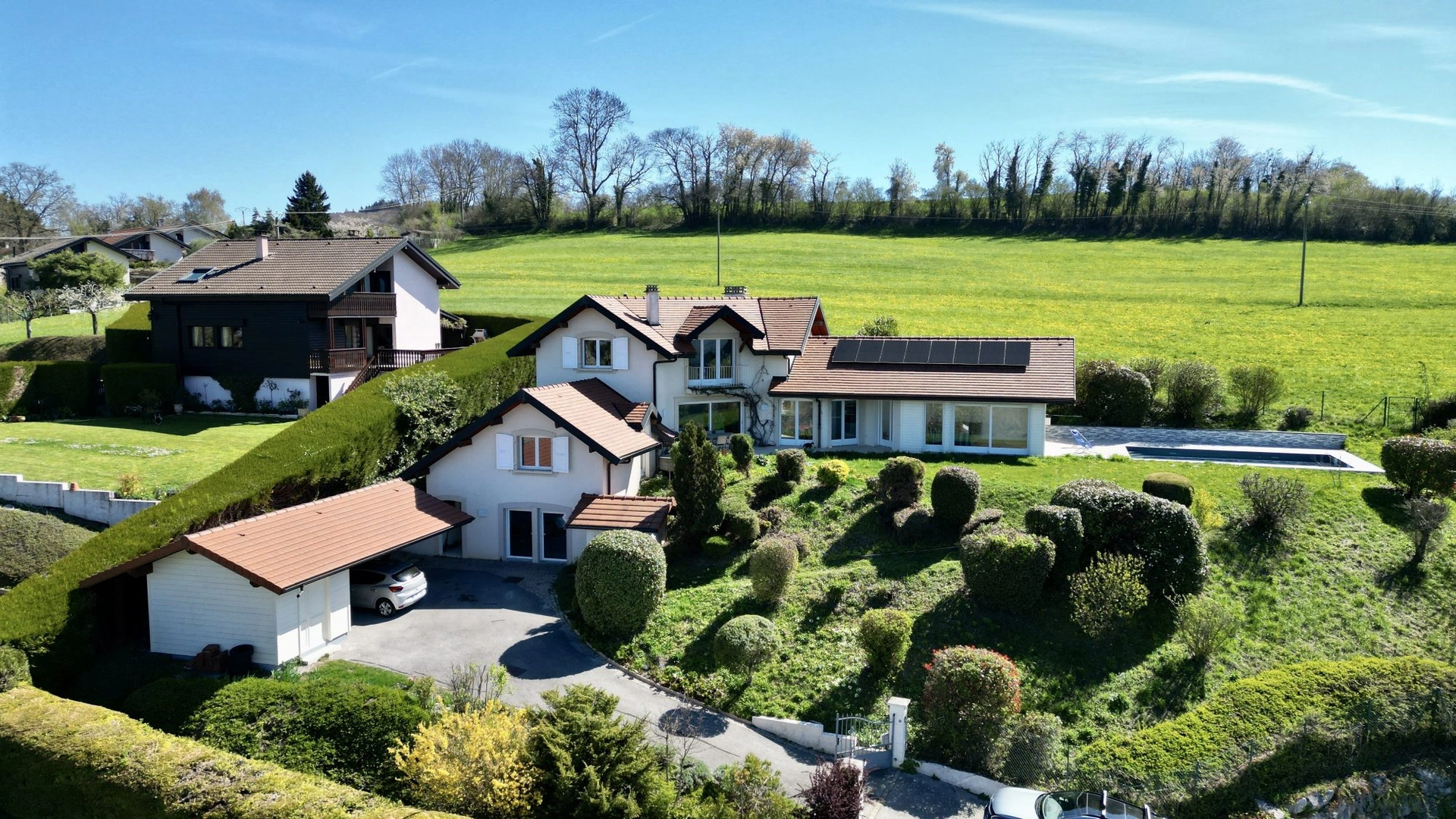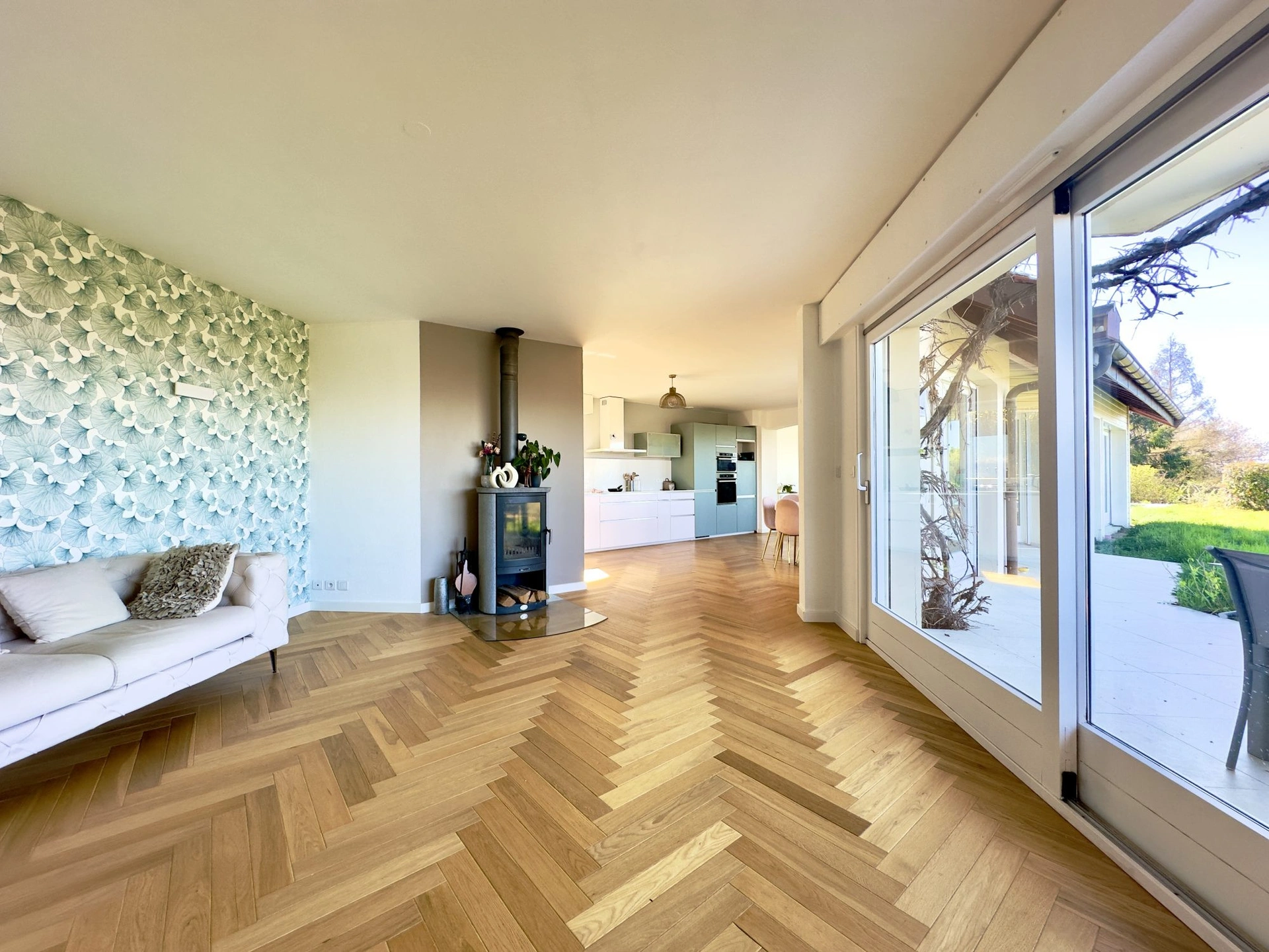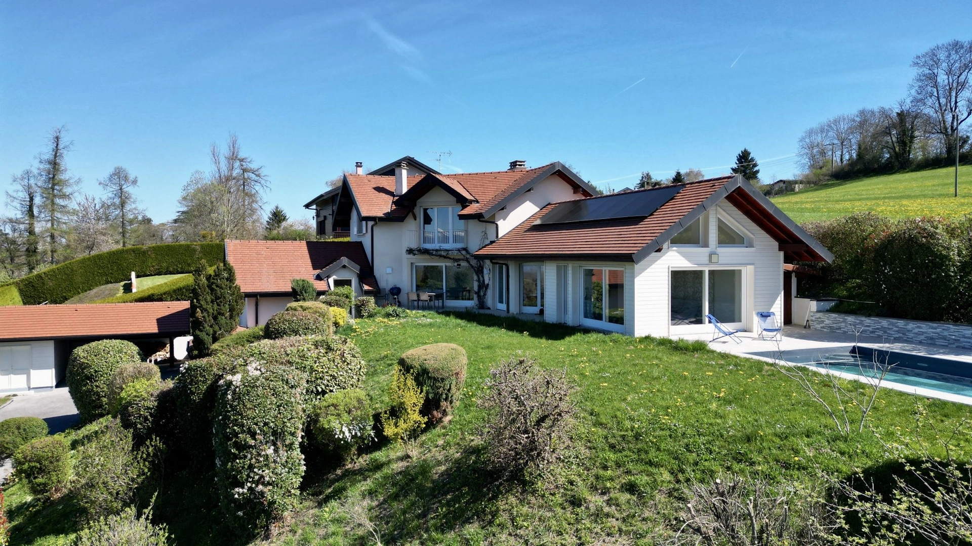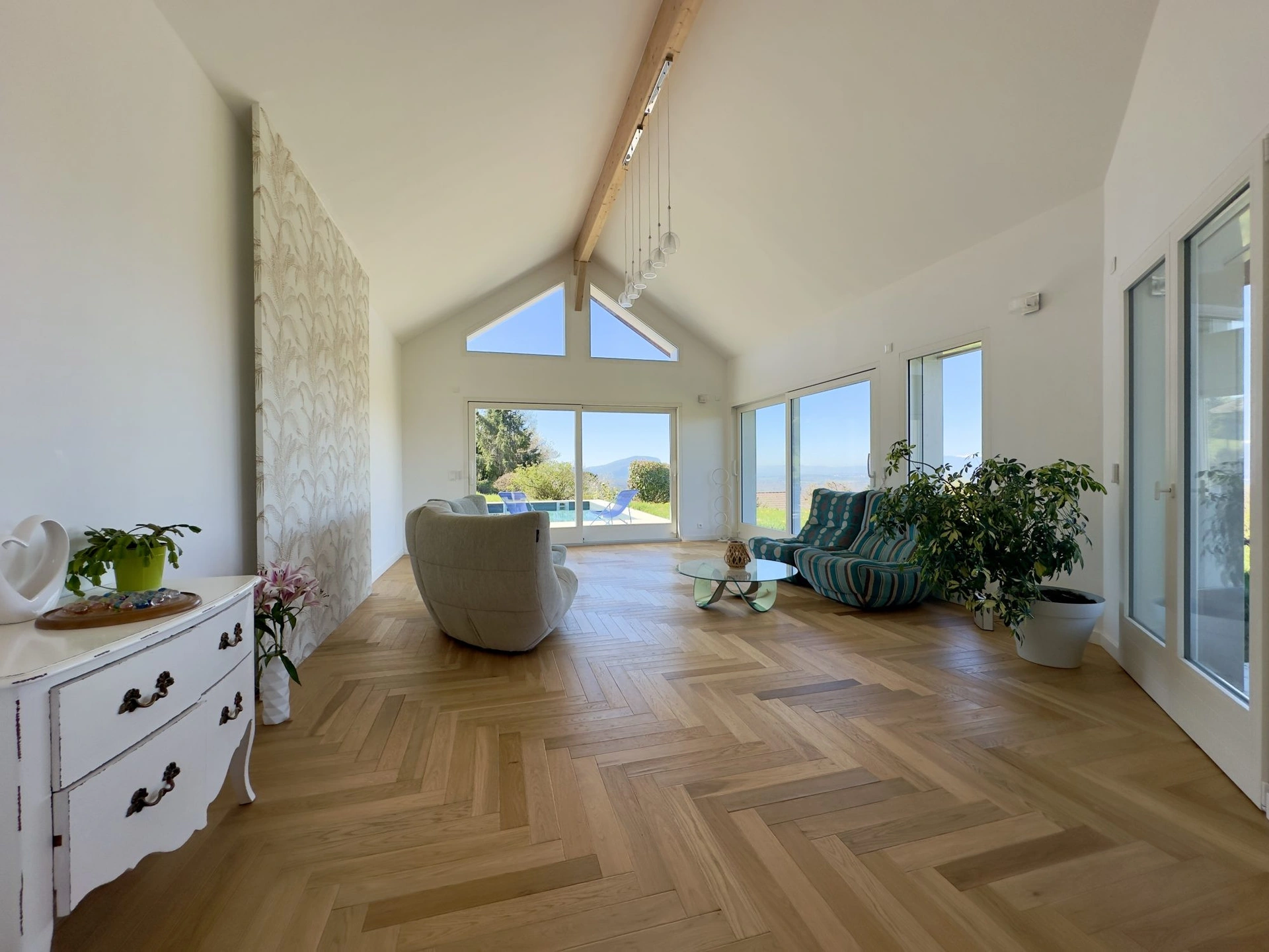 Implantée sur un terrain paysager de 1 800 m², cette demeure a bénéficié d’une extension pensée avec soin par ses propriétaires, permettant de profiter pleinement d’un panorama spectaculaire sur la piscine et la nature environnante.