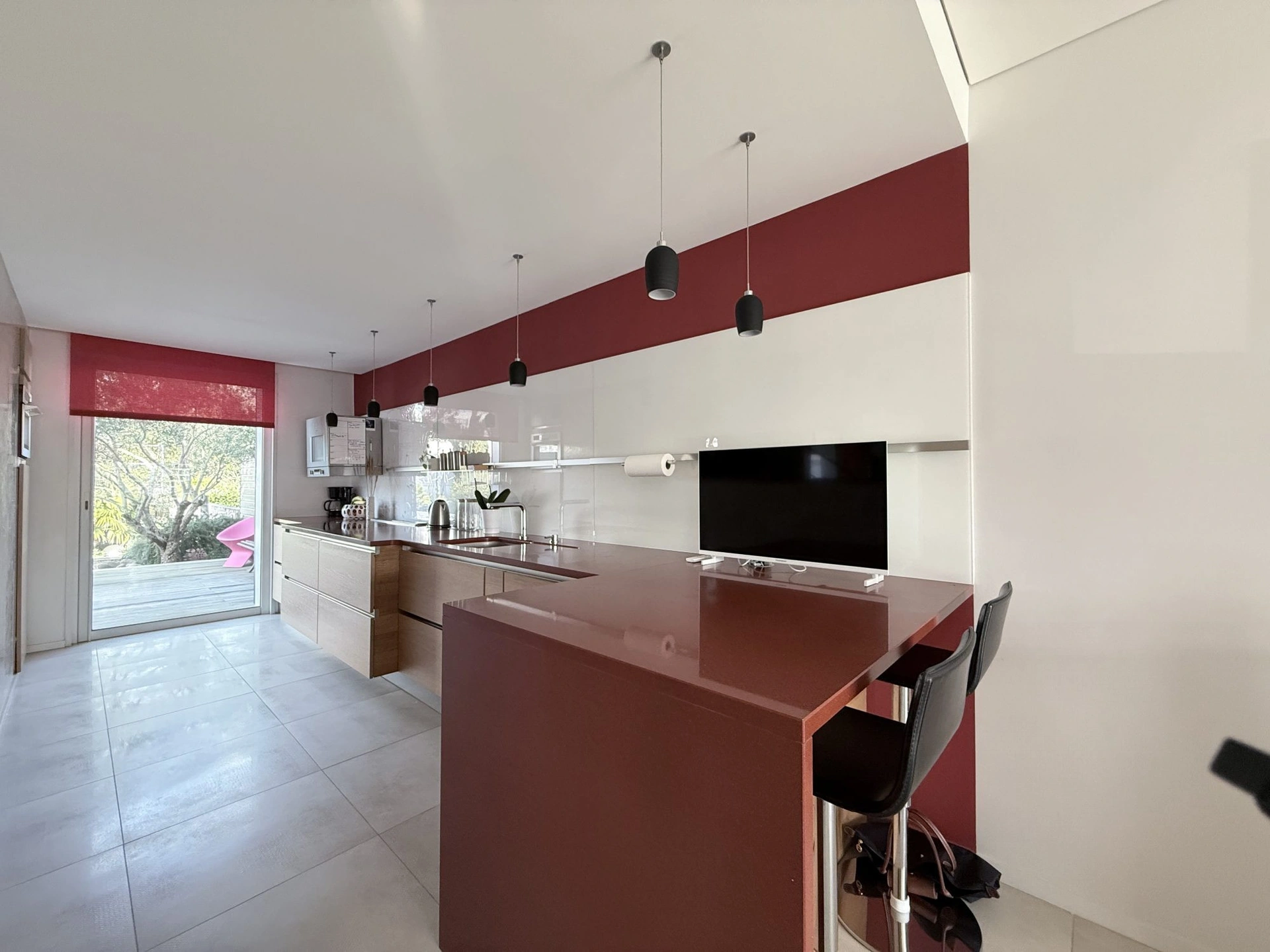 La pièce principale, ouverte et lumineuse, prolonge naturellement la vie vers l’extérieur, tandis que la cuisine, élégante et fonctionnelle, s’intègre parfaitement à cet esprit de convivialité.