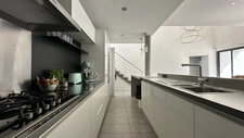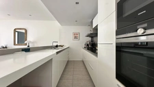 La baie vitrée connecte la vie intérieure avec la vue extérieur sur la piscine et le jardin paysagé. Le dessin de la cuisine, les matériaux choisis, la sonorisation Bose encastrée, tout ici raconte le haut de gamme sans jamais en faire trop.