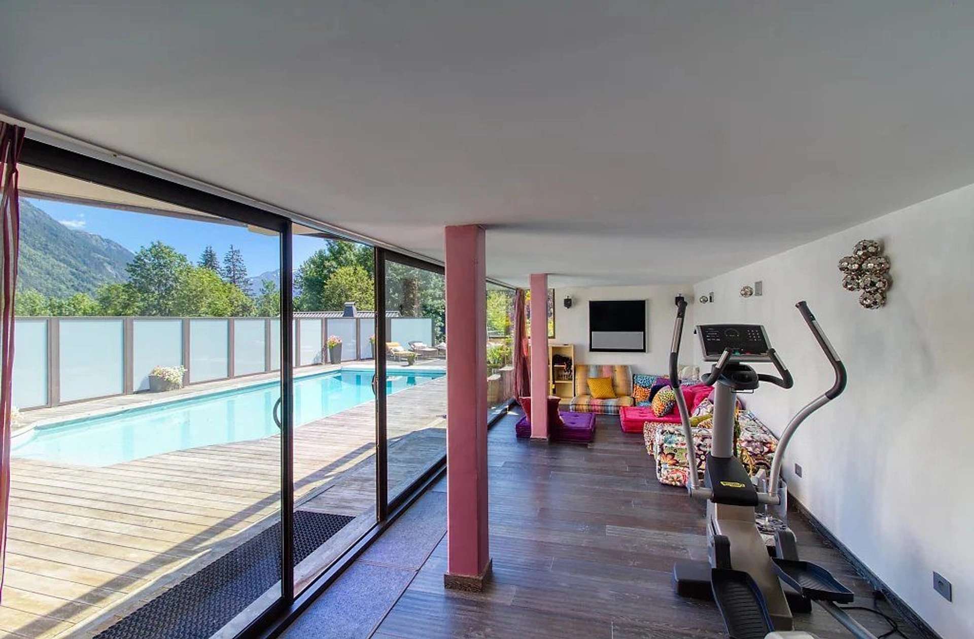 Le chalet est également équipé d’une salle de fitness, ouvrant directement sur une une superbe piscine qui s’intègre harmonieusement dans le paysage environnant.