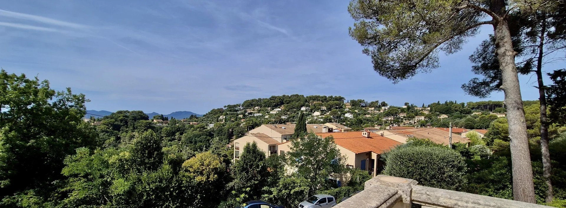 A l'extérieur, large terrasse aménagée avec sa piscine, beau jardin entourant la maison, espace de parking pour 3 ou 4 voitures, portail automatisé, très belle vue sur les collines environnantes et même aperçu mer !