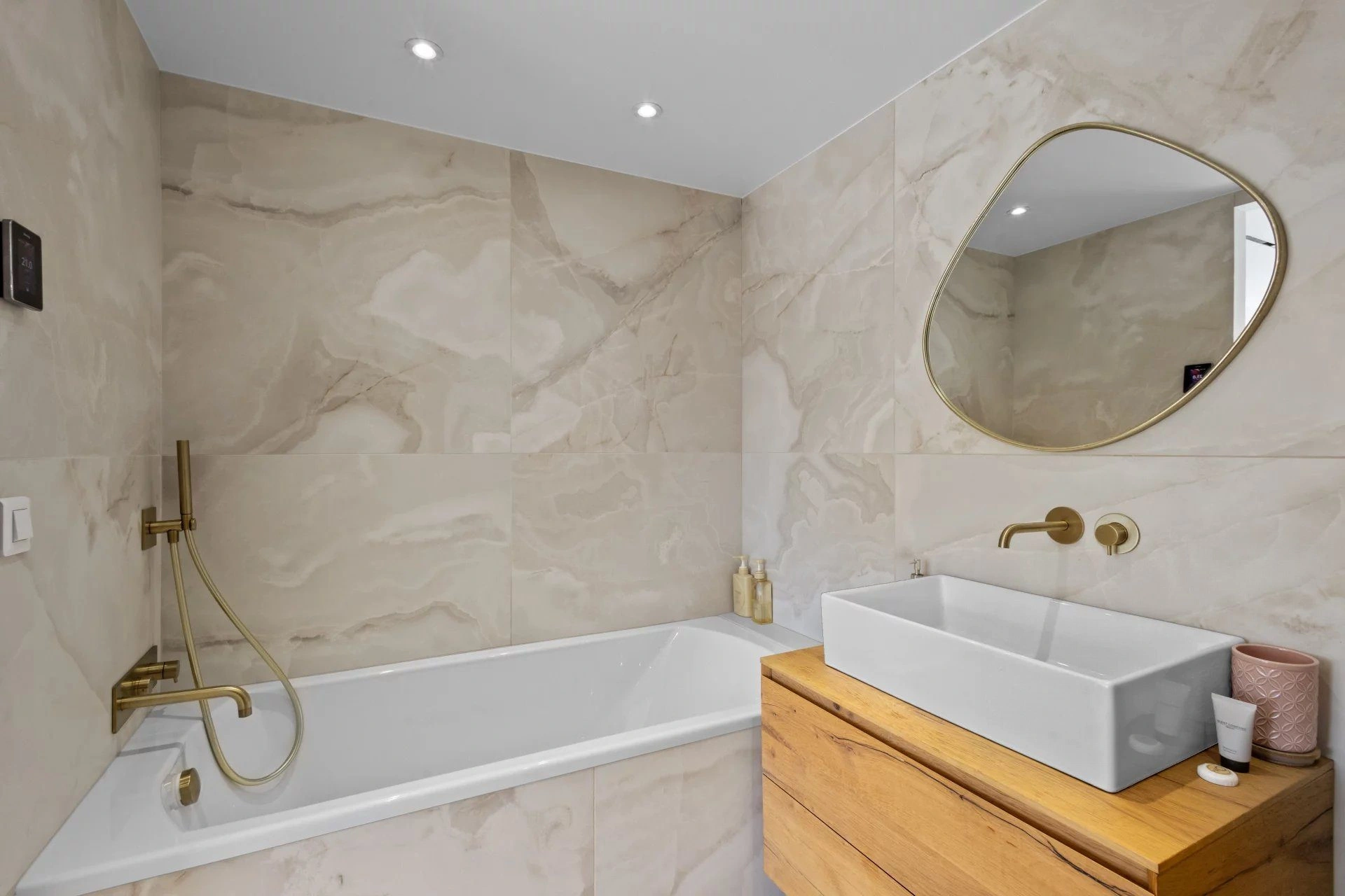 - vaste séjour de près de 60m2 avec cuisine ouverte dotée d'un électroménager haut de gamme (Miele) et d'un plan de travail et crédence en marbre veiné