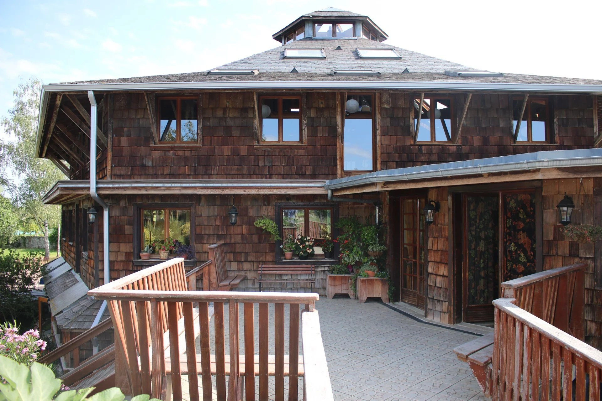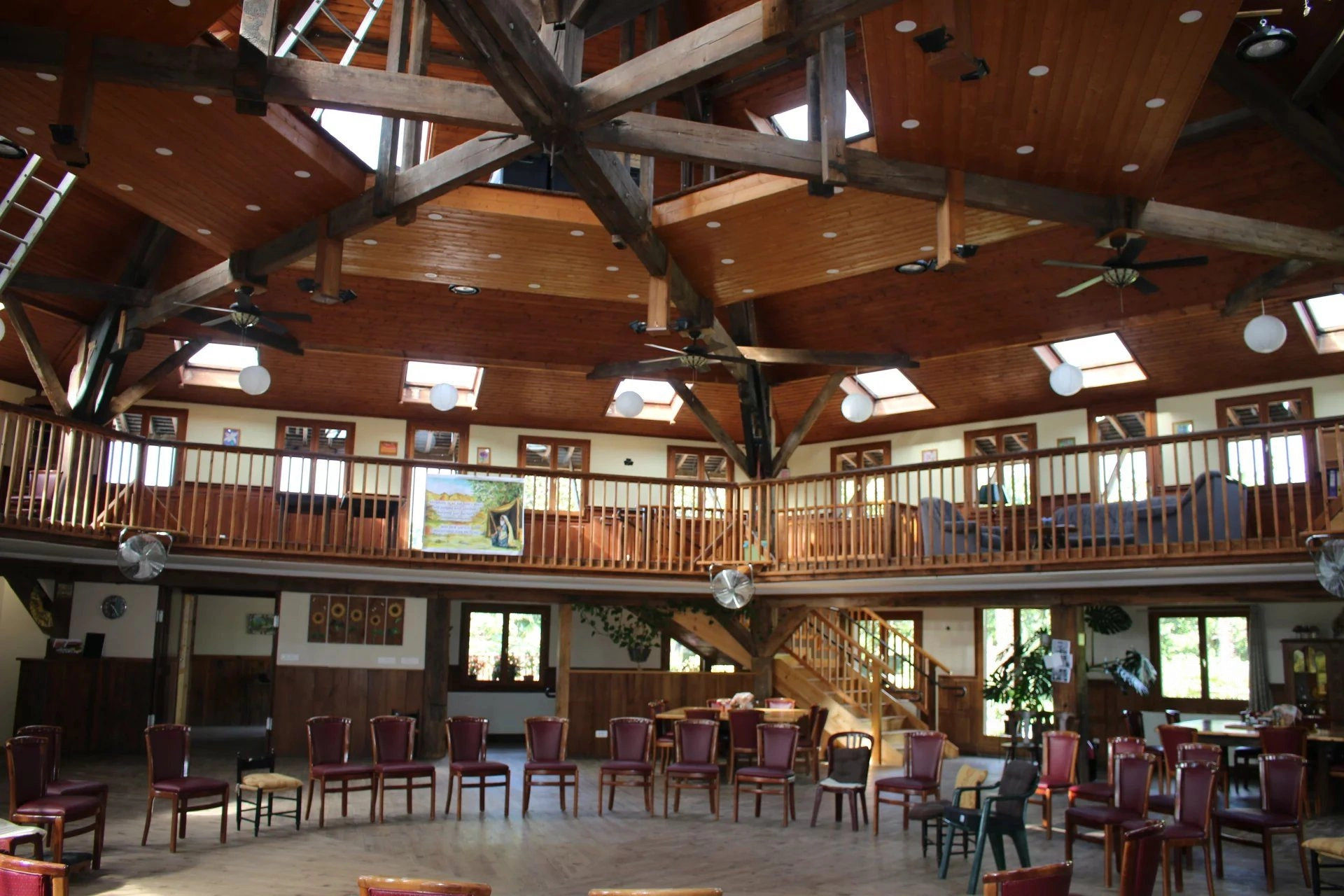 - un bâtiment en bois hexagonal récent avec grande capacité de réception, d’une superficie au sol totale de 1050m² sur 2 niveaux plus une mezzanine. Au rez de chaussée, cuisine tout équipée avec pièces de stockage, chambres froides positives et négatives. A l’étage, une grande salle de réunion très lumineuse plus un vaste salon.