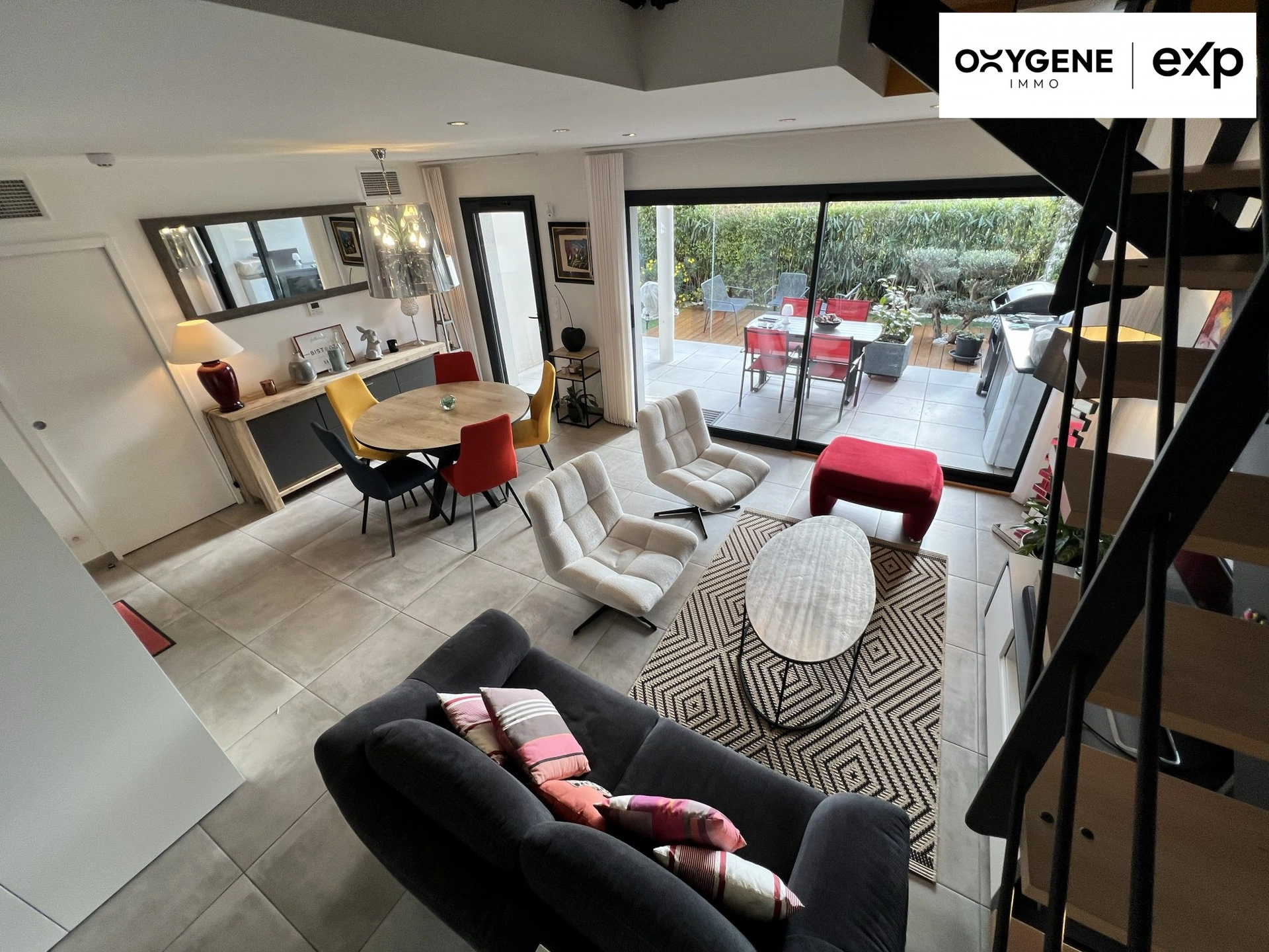 Le rez-de-chaussée offre un espace de vie lumineux - exposé plein sud - ouvert sur la terrasse et sa cuisine d'été, offrant une vue directe depuis le salon et le séjour, ainsi qu'une cuisine parfaitement équipée.