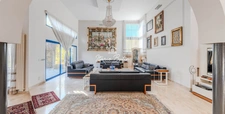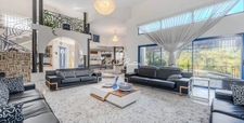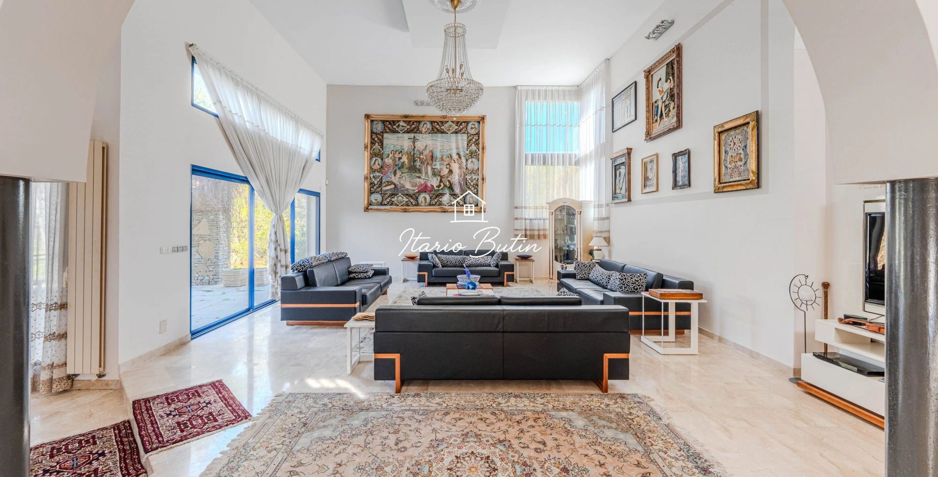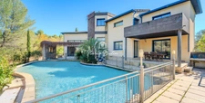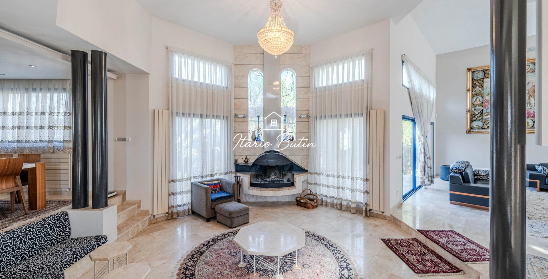 L’espace de vie, sublimé par une cheminée et de belles hauteurs sous plafond, propose des volumes remarquables et une luminosité naturelle. Il s’ouvre directement sur une terrasse couverte avec piscine et une vue dégagée.